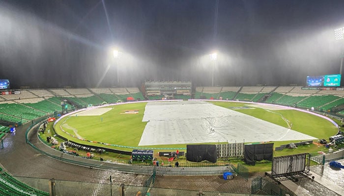 Ground covered with tarpaulins at Gaddafi Stadium, Lahore, after rain ahead of PSL 11 clash between Lahore Qalandars and Multan Sultans on April 3, 2026. — PSL